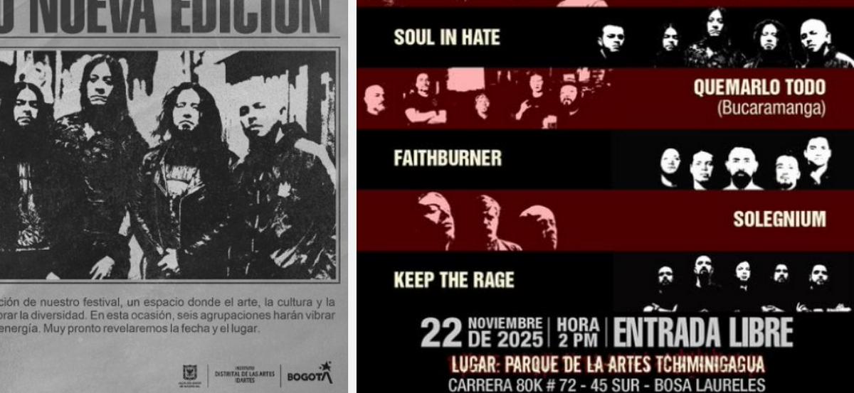 El festival de música alternativa conocido como ‘Fucking Hate Festival – Arma tu festival’ se erige como uno de los eventos más representativos en el ámbito del rock, metal y sus múltiples variantes dentro de la escena artística bogotana. Bajo la organización y apoyo del Instituto Distrital de las Artes (Idartes) y la plataforma “Bogotá, mi Ciudad, mi Casa”, este acontecimiento busca consolidar un punto de encuentro para bandas tanto emergentes como consolidadas, permitiendo que los sonidos de la resistencia y la identidad artística local encuentren un espacio legítimo de circulación y expresión pública. La nueva edición del festival tendrá lugar el próximo 22 de noviembre, en el parque Chiminigagua, ubicado en la carrera 80k #72 sur-30, a partir de las 2:00 p. m., con la particularidad de que la entrada será completamente libre.