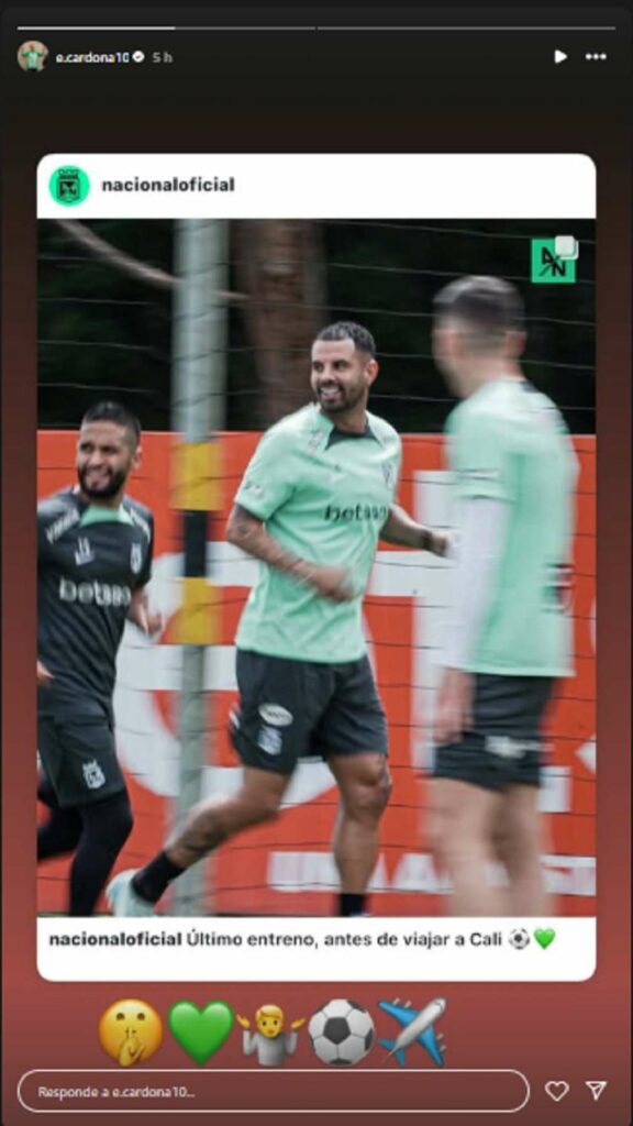 De hecho, en una historia posterior publicó una fotografía del equipo en un avión con miras al viaje del equipo a Cali para el duelo de vuelta ante América de Cali, luego del triunfo de Nacional 3-1 en Medellín.
