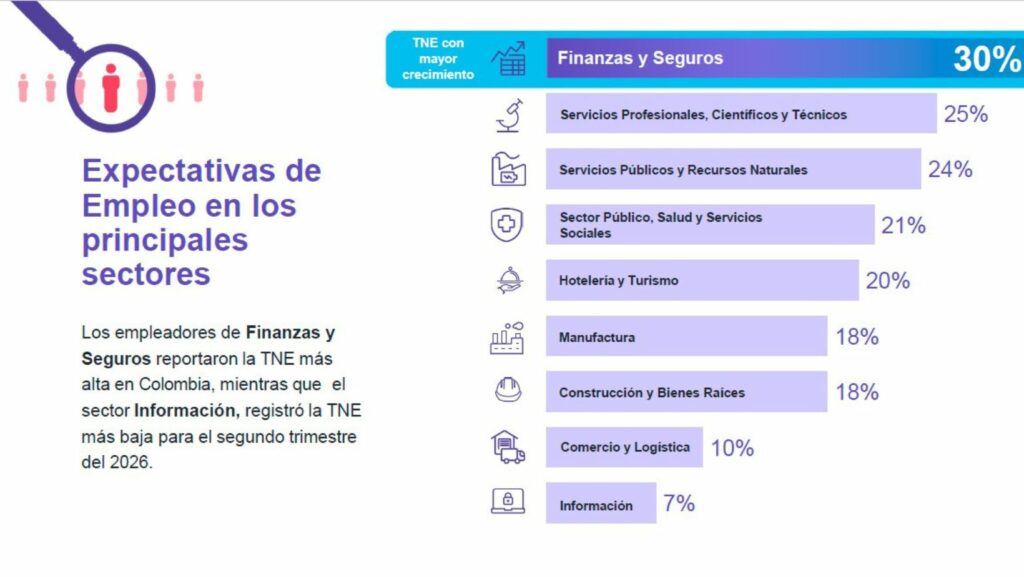 El informe destaca que el sector de finanzas y seguros lidera las expectativas de contratación, con una TNE del 30 %, consolidándose como el más dinámico del trimestre. También se mantienen con perspectivas positivas actividades como la construcción, la manufactura y los servicios profesionales.