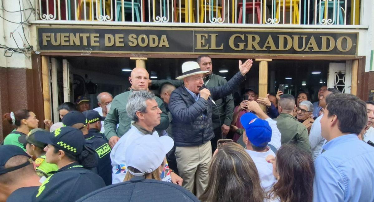 Cerca de las 10:30 a. m., en la carrera 23 con calle 20, la entrada a la Fuente de Soda El Graduado se robó las miradas de caminantes, clientes y funcionarios de otros edificios. Un par de minutos antes, el jefe del Centro Democrático había llegado desde la Galería.