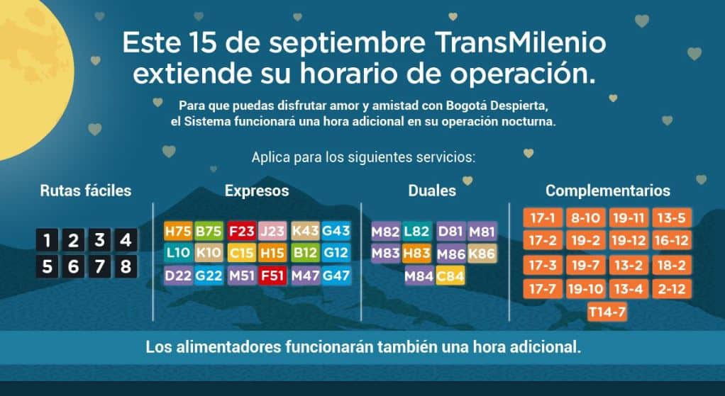 Mientras tanto, Transmilenio anunció que algunos servicios del sistema de transporte público tendrán una hora adicional en el funcionamiento. Se trata de las siguientes rutas expresos y fáciles:
