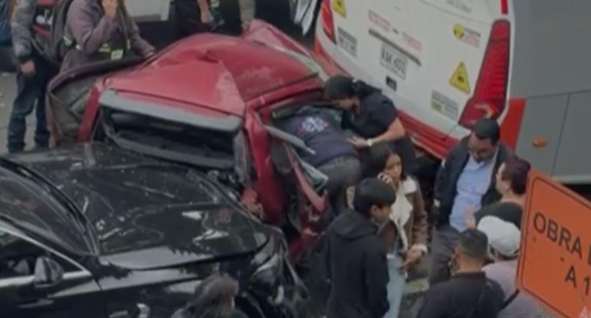 El siniestro múltiple se registró en la Autopista Norte. Bomberos tuvieron que rescatar a una persona que quedó atrapada entre los hierros del particular.