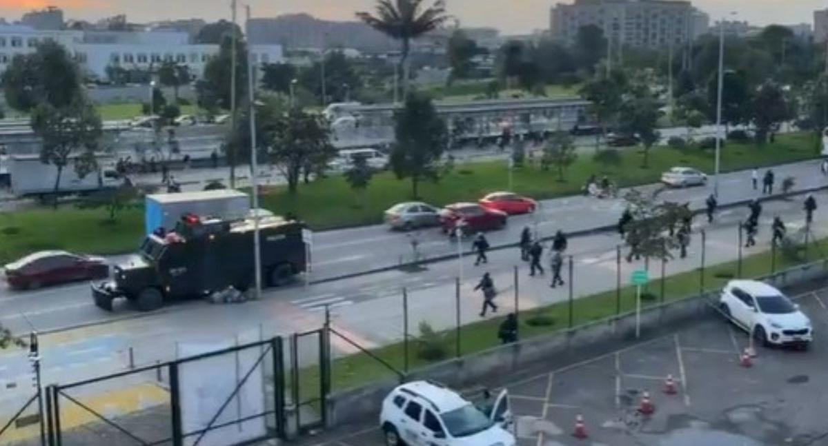 Las imágenes muestran el caos total en la vía, mientras los uniformados suben por el carril que usualmente va hacia el occidente, tratando de abrirse paso entre bloqueos y desorden en el entorno del campus universitario.