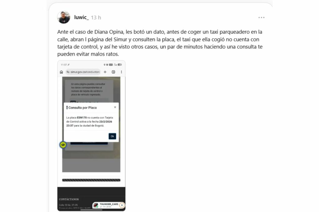Por otra parte, se conoció una verificación hecha en la plataforma del Sistema de Información de Movilidad Urbana y Regional (Simur) que encendió nuevas alertas: el taxi que abordó la mujer no cuenta con tarjeta de control activa. La consulta por placa, compartida en redes, muestra que el vehículo no tenía ese registro habilitado para operar en Bogotá.