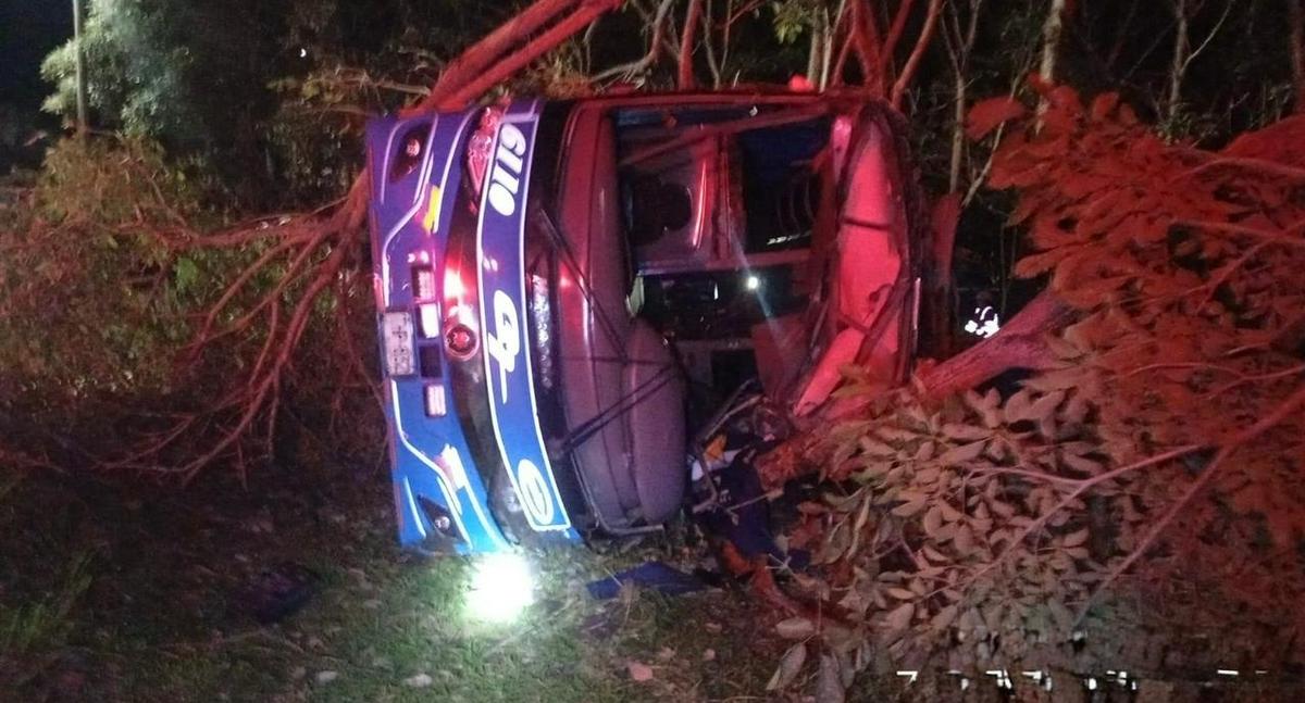 El accidente de tránsito ocurrió en el kilómetro 13+400, en la glorieta de Payandé, cuando el vehículo —identificado con placas THP 832— se salió de la vía y terminó en un volcamiento lateral. En el automotor viajaban cerca de 27 pasajeros, quienes vivieron momentos de angustia tras el fuerte impacto.