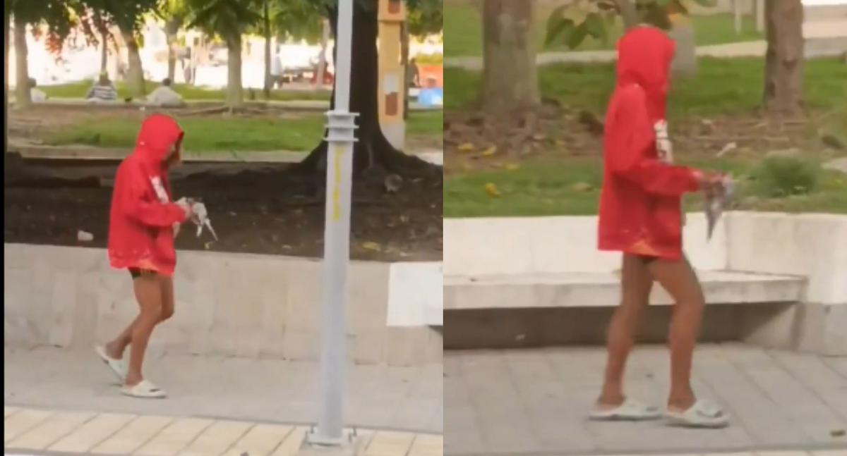 Una vez que le quita la extremidad, la habitante de calle lanza el cuerpo sobre la avenida, sin asomo de pena o arrepentimiento. Luego, sigue caminando y se marcha. Los que grabaron la situación se acercaron hasta el ave y claramente se aprecia que era de verdad y no se trataba de un peluche o un juguete.