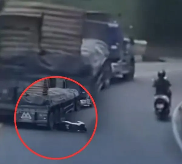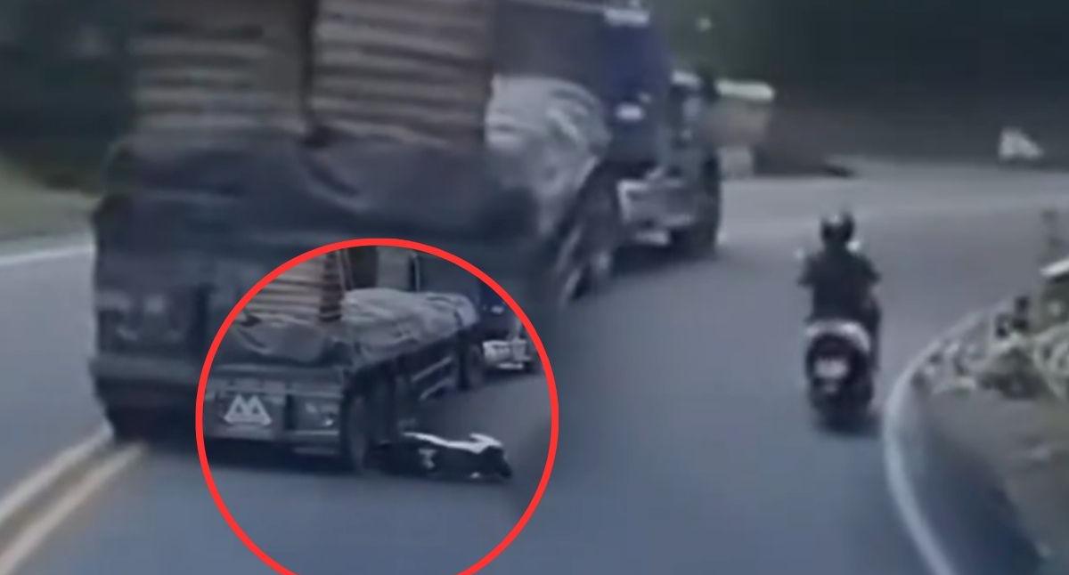 En las imágenes se observa cómo el motociclista pierde la estabilidad justo cuando un tractocamión lo adelanta en plena curva. La fuerza del vehículo pesado lo desestabiliza y lo lanza hacia un costado de la carretera, quedando a escasos centímetros de las llantas del camión, en una escena que por segundos puso su vida en grave riesgo.